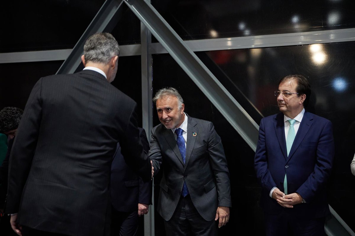El Rey Felipe VI (1i) saluda al presidente de Canarias, Ángel Víctor Torres (c), a su llegada a la 43 edición de la Feria Internacional del Turismo, Fitur 2023, en IFEMA Madrid, a 18 de enero de 2023, en Madrid, (España). Fitur es la primera cita anual - Jesús Hellín - Europa Press