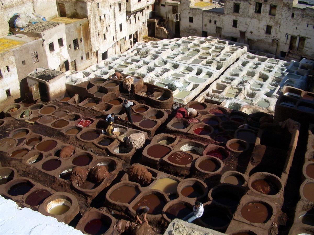 Tejedores, orfebres, tenderos, curtidores, artesanos y otros mucho más forman un universo muy peculiar, casi único en el mundo, donde hay que oler, probar y tocar. En el afamado barrio de los curtidores los trabajadores enfangados en el interior de las cubetas de piedra o de madera siguen trabajando las pieles con las técnicas medievales quitando, primero, la lana con cal viva, lavando después las pieles con agua y sal (2-3 días) y mezclándolas con excrementos de paloma (1 día) para acabar dándole una gran gama de tintes y un proceso de secado que se alarga en función de las horas de sol durante otros 3 días.