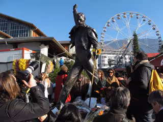 Pocos mercadillos navideños en la vieja Europa pueden gozar de un emplazamiento tan bello como el de Montreux. Ubicado a las orillas del Lago Leman y presidido por la estatua de Freddy Mercury, el legendario líder de "Queen" residente en esta ciudad que inspiró la mayoría de sus canciones, el mercadillo se expande a través del paseo junto al lago repleto en estas fechas de puestos de madera, unos ciento cincuenta entre artesanos y comerciantes. La oferta es enorme y variopinta: lámparas, artesanía, velas, chocolates, golosinas, jabones, joyas, decoración navideña y una larga lista de regalos que hacen de este "Montreux Noel" un destino especial. No faltan chalets o puestos para degustar típicos menús del país o "fast food", aunque la sorpresa siempre está a la vuelta de cada esquina. En el terreno gastronómico, con calderos mágicos al estilo druida y platos para combatir el frío (salchichas, raclettes, té de leñadores, vino caliente con cáscara de limón...), o en el puramente de ocio como el estrenado este año con una pista de esquí de fondo, de medio kilómetro, que utilizan jóvenes y mayores casi rozando las aguas del Leman, repletas de luces y reflejos procedentes de este mágico paraíso iluminado. Es una oportunidad única para "esquiar" en un sendero de palmeras con algunos testigos curiosos: los patos y cisnes del lago. Para la organización se trata del quinto ambiente original del mercadillo.