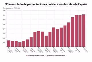 En el último mes de 2019, las pernoctaciones en establecimientos hoteleros se incrementaron un 1,5% respecto a diciembre de 2018, hasta sumar 16,9 millones, gracias tanto a las pernoctaciones de los no residentes, que aumentaron un 1,6%, como a las realizadas por los españoles, que se incrementaron un 1,5%.