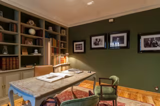 La recepción se sitúa en lo que fuera el despacho de Adolfo Suárez, una estancia en la que se abordaron las bases de la actual Constitución y en la que se cree que Suárez se reunió con Santiago Carrillo para negociar la legalización del Partido Comunista. Preside la sala una gran librería de la época de Suárez con una pequeña puerta secreta diseñada para facilitar su huida en caso de emergencia.