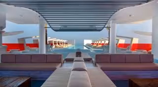 La gran terraza situada en la última planta del hotel, cuenta con una piscina de borde infinito, y un excepcional lounge abierto al cielo con vistas panorámicas sobre el mar Mediterráneo. El resort también incluye un centro comercial para los huéspedes del hotel.