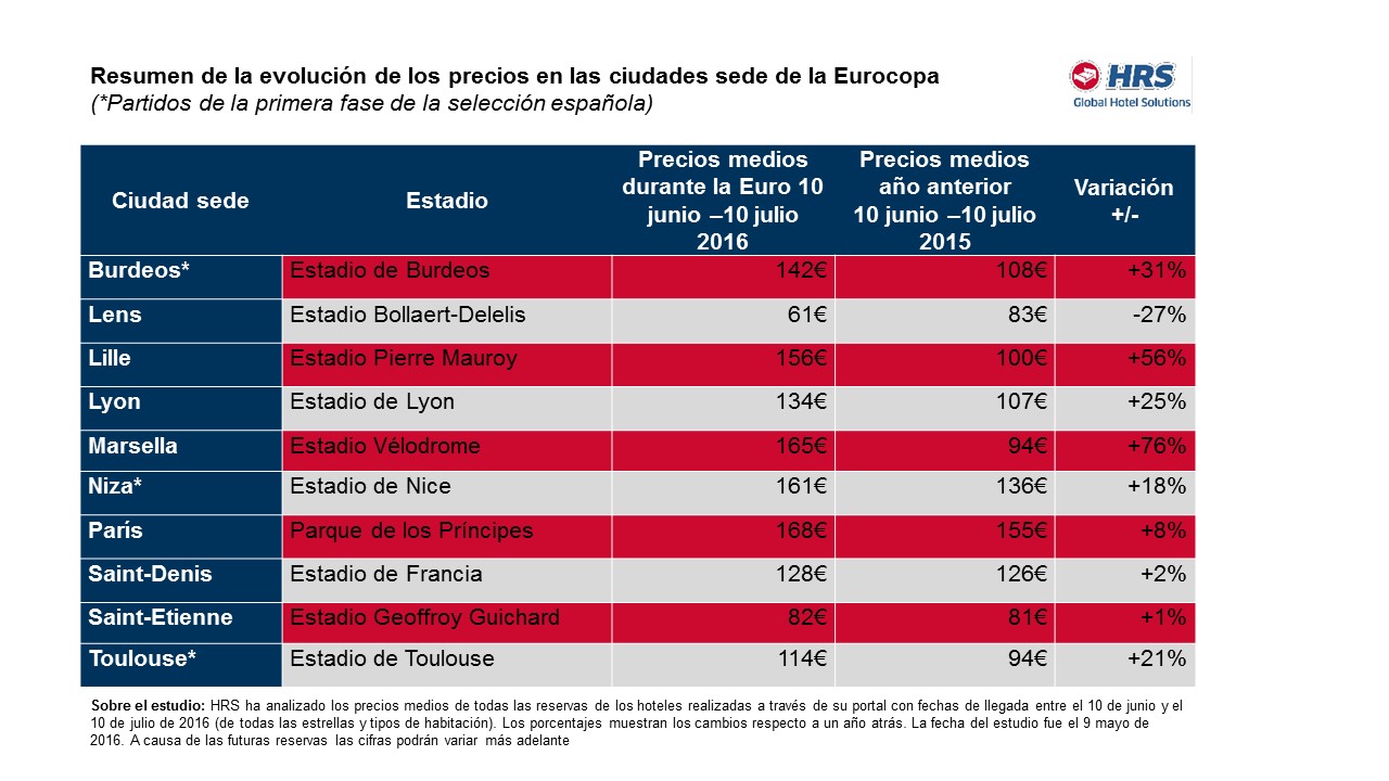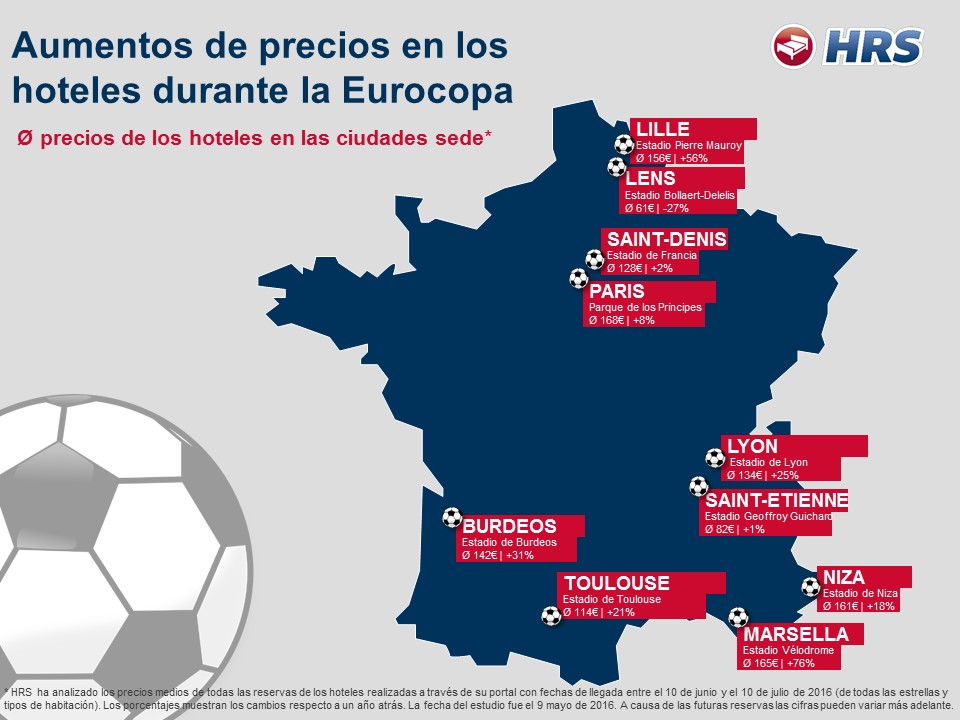 La presencia de las selecciones favoritas del torneo en determinadas ciudades ha provocado los mayores aumentos, como en Marsella, donde jugará la anfitriona de forma que una noche de alojamiento durante el campeonato tendrá un coste de 165 euros, un 76% más que hace un año. En Lille la subida media es del 56%, y en Burdeos, donde jugará unos de sus partidos España, el aumento es del 31%.
