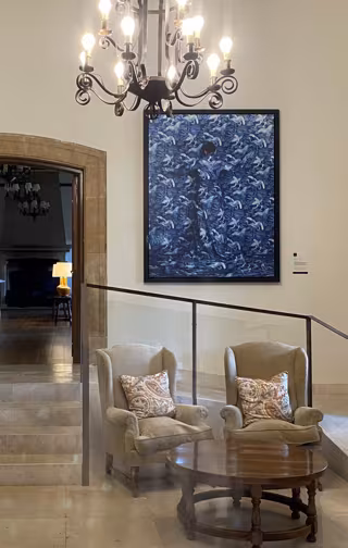 La muestra dialoga con la historia de Tordesillas, evocando episodios como el encierro de Juana I de Castilla o la firma del Tratado de 1494. Destaca la obra Vuelo azul de Cecilia Paredes, instalada en la recepción, como homenaje visual a la reina confinada durante 46 años.