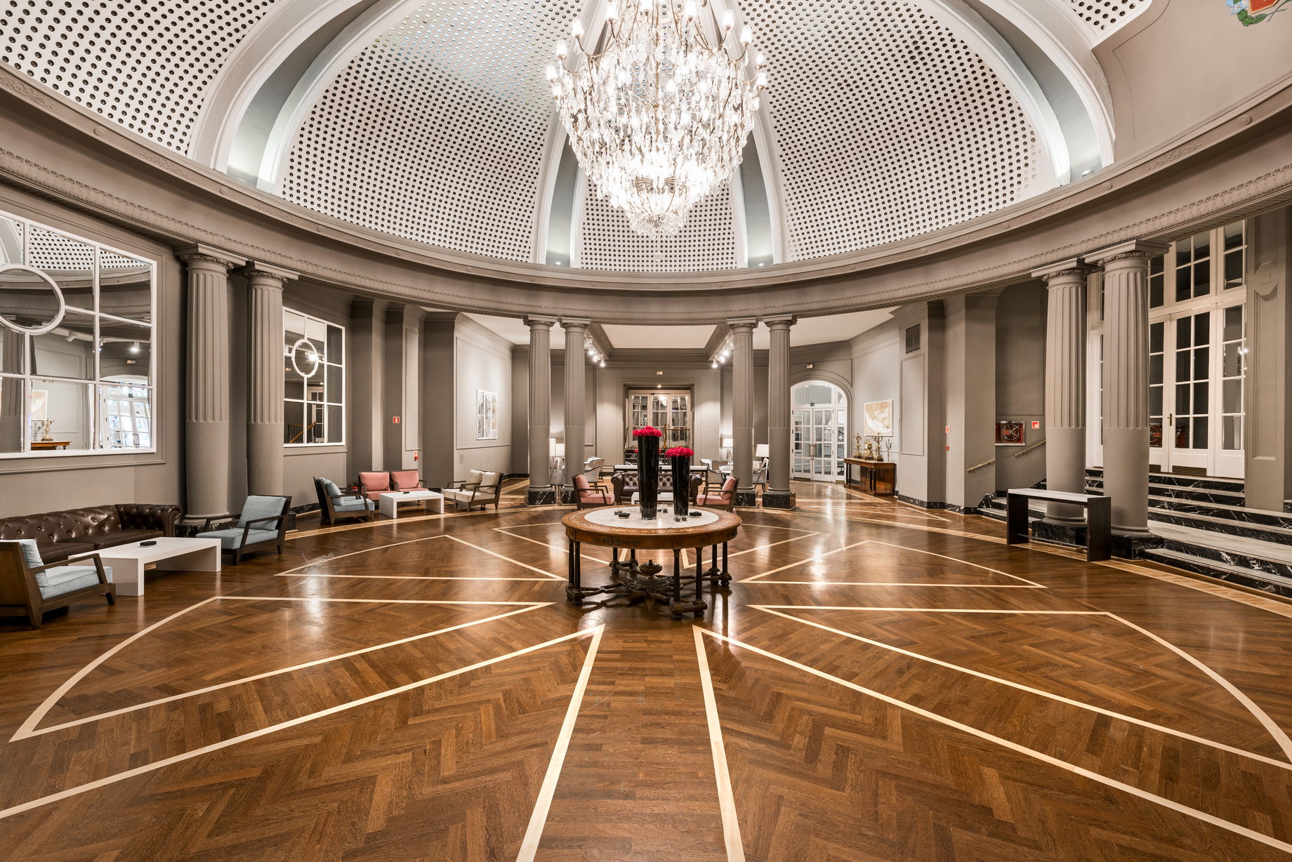 Los materiales empleados, así como las formas y mobiliario, evocan la sofisticación propia de los años 20, pero con una visión contemporánea. Destaca la majestuosa cúpula que acoge el lobby, al estilo de las que coronan los grandes hoteles europeos de la misma época, junto a la majestuosa lámpara de araña de principios del siglo XX, testigo de los principales acontecimientos sociales y políticos de la historia reciente de Zaragoza.