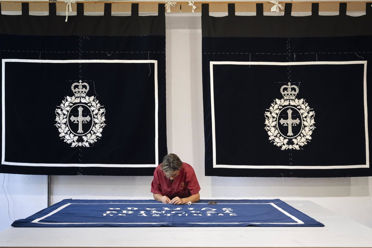 El trabajo ha consistido en la confección de siete reposteros en terciopelo de algodón azul marino, con unas dimensiones de 130 centímetros de alto y 210 centímetros de ancho. Cuatro de ellos incorporan la Cruz de la Victoria, símbolo de Asturias y escudo de la Fundación Princesa de Asturias.