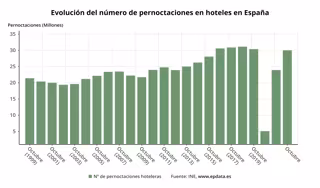 Los establecimientos hoteleros españoles superaron el pasado mes de octubre los 30 millones de pernoctaciones, lo que supone un aumento del 25,4% respecto al mismo mes de 2021, según datos hechos públicos este jueves por el Instituto Nacional de Estadística (INE) que muestran un incremento de casi el 11% de la facturación media diaria de los hoteles por habitación ocupada rondando los 100 euros.