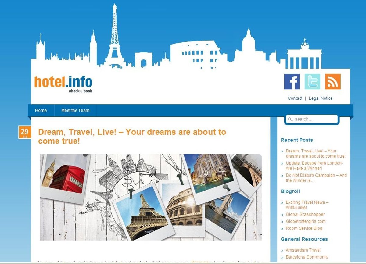 hotel.info ha lanzado el nuevo concurso de iDream e iTravel, que brinda a sus más fieles seguidores la oportunidad de realizar un viaje por Europa, según ha informado este lunes el servicio de reservas hoteleras.