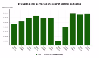 Las pernoctaciones en alojamientos turísticos extrahoteleros españoles (apartamentos, campings, alojamientos de turismo rural y albergues) superaron los 21,7 millones en julio, con un aumento del 1,7% respecto al mismo mes del año pasado. Este dato contrasta positivamente con la caída del -2,3% registrada el mismo mes del año anterior.