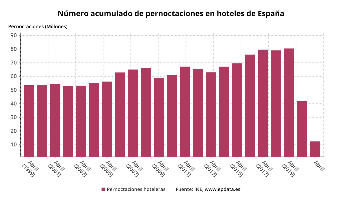 El INE no ofrece la comparativa anual de abril de 2021 sobre abril de 2020 debido a que los establecimientos hoteleros permanecieron cerrados en el cuarto mes del año pasado para la realización de cualquier actividad turística, por lo que no hubo ni entrada de viajeros ni pernoctaciones durante ese mes.