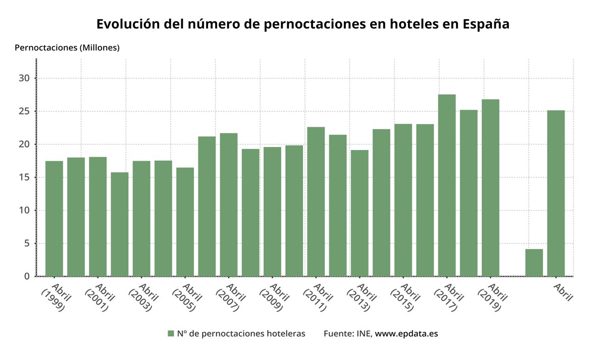 Pese a este fuerte repunte, las pernoctaciones registradas en abril de este año por los hoteles españoles son inferiores a las que hubo en abril de 2019, antes de la pandemia, cuando se registraron 26,8 millones de pernoctaciones.