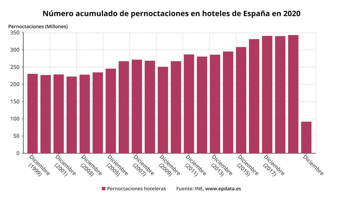 Las pernoctaciones en establecimientos hoteleros españoles alcanzaron las 91,6 millones en 2020, lo que supone un desplome del 73,3% respecto a 2019, su mayor descenso de toda la serie histórica, según datos del Instituto Nacional de Estadística (INE) que cifra en un 6% la caída de precios hoteleros el pasado año.