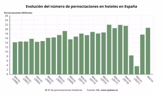 Las pernoctaciones en establecimientos hoteleros españoles durante el pasado mes de marzo superaron los 20,6 millones, lo que supone un 17,1% más que el mismo mes del año anterior, según datos del Instituto Nacional de Estadística (INE) dados a conocer ese lunes que también muestran como los hoteles facturaron 99,3 euros de media por habitación ocupada, un 11% más que el año anterior.