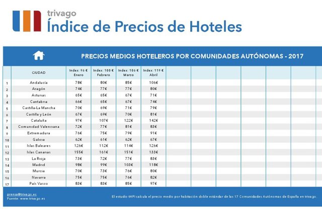 Los precios hoteleros en España se han situado en 119 euros de media en abril, lo que supone un aumento del 7% en comparación con el mismo mes de 2016 (11 euros), según el último estudio tHPI de Trivago, que calcula el precio medio por habitación doble estándar en las 40 ciudades más buscadas.