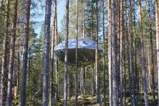 La cadena sueca Treehotel ha añadido un nuevo alojamiento a su original portafolio: una nave espacial de 30 metros cuadrados colgada entre árboles con sitio para una familia de cuatro miembros con acceso a través de una escalerilla