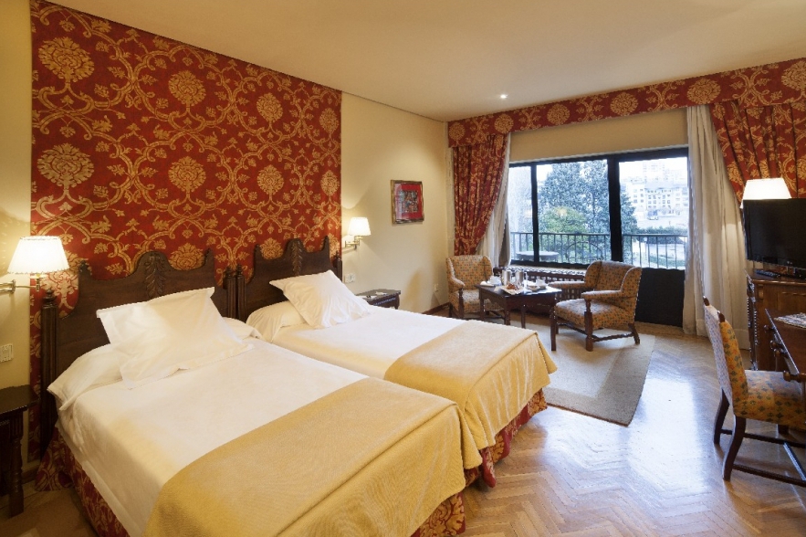 Otra habitación destacable es la del Torreón, ubicada en uno de los torreones de la fachada plateresca del hotel. Para acceder a la estancia hay que subir unas escaleras y en lo alto, como una almena, se encuentra la habitación que se asoma a la plaza de San Marcos.