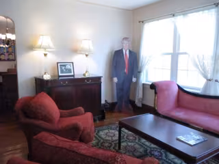 Los muebles representan la opulencia en la que vivía la familia Trump. A la casa no le faltan detalles como conexión a Internet y televisión por cable además de una imagen de cartón a tamaño real de Trump en el salón "un gran compañero para ver las noticias hasta altas horas de la noche", según el anuncio en la web.