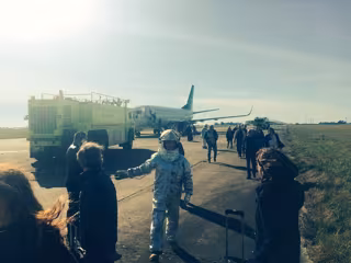 La noticia se dio a conocer después de que el director de la productora de cine Medio&Medio Films, Federico Lemos, compartiera la información a través de su cuenta en Twitter, donde mostró una foto de los pasajeros bajando del avión para ser inspeccionados.