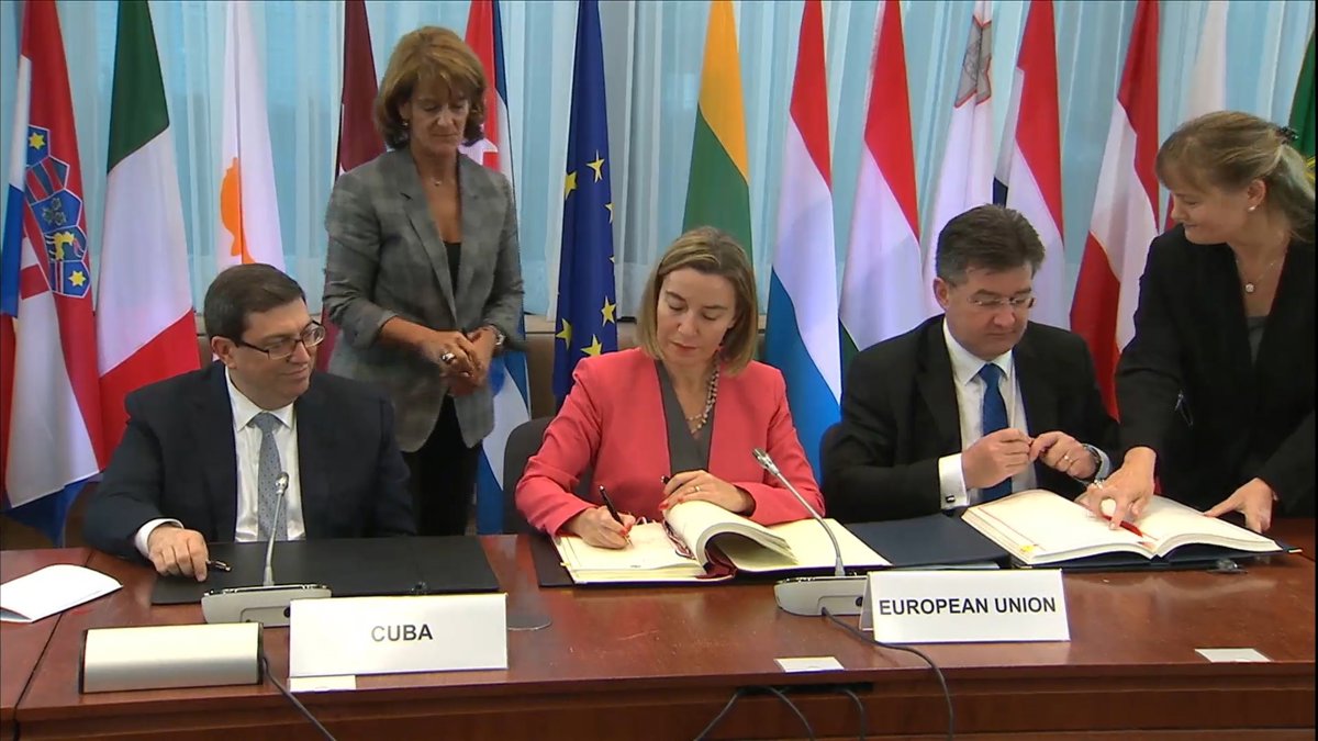 La Alta Representante de Política Exterior y Seguridad Común de la UE, Federica Mogherini, los ministros de Asuntos Exteriores de los Veintiocho y el ministro de Relaciones Exteriores de Cuba, Bruno Rodríguez, han rubricado el acuerdo de diálogo político y de cooperación que concluyeron en marzo en La Habana.