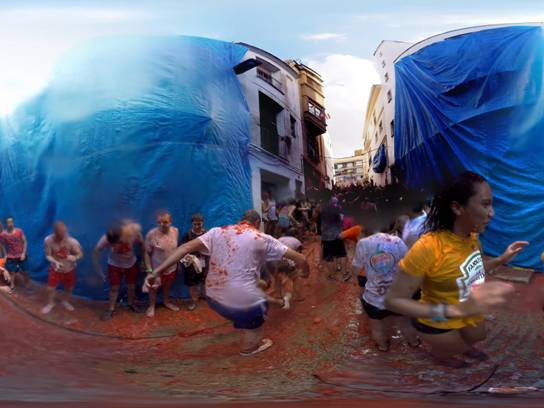 Uno de los audiovisuales inmersivos que más llamó la atención fue el dedicado a la Tomatina, ya que mediante el uso de los visores 360º, la campaña de Turismo de España transporta al potencial visitante a las calles de Buñol, en plena batalla de tomates.