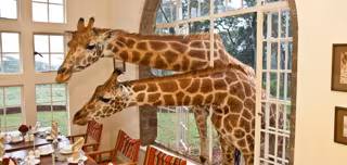 El hotel Giraffe Manor en Langata, cerca de Nairobi, es un hotel que destaca por su inmenso territorio donde viven jirafas, por ello estos animales tienen autorización para meter su cabeza por las enormes ventanas del comedor para que los huéspedes los fotografíen y los perciban en su habitat natural.