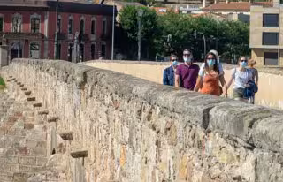 Turistas por pasean por el puente romano de la ciudad de Salamanca durante la pandemia del Covid.19. Salamanca 24 de agosto del 2020 - Eduardo Briones - Europa Press