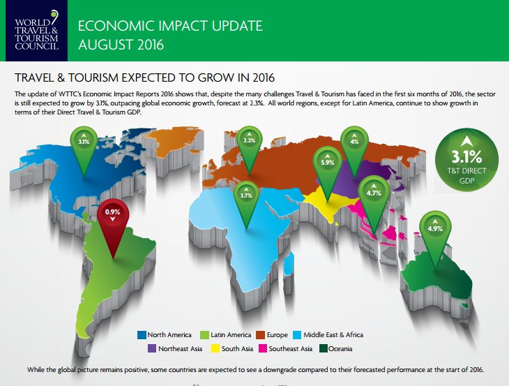 La industria del turismo y los viajes en todo el mundo crecerá un 3,1% de media en 2016, por encima del crecimiento de la economía global (+2,3%), según las previsiones del Consejo Mundial de Viajes y Turismo (WTTC, por sus siglas en inglés), que destaca la resistencia del sector pese a la caída de la demanda en Europa, tras los atentados, y la menor contribución del turismo a las economías de Francia, Turquía y Brasil.