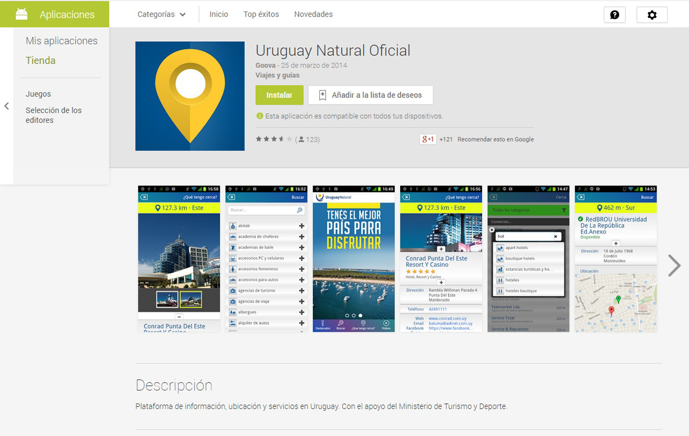 'UruguayNatural', se puede descargar desde la tienda virtual Play Store de Google y desde la Appstore de iPhone. Ofrece más de 130 categorías de búsqueda y facilita el acceso al canal IP UruguayNatural TV, que consta de más de 1.500 vídeos de interés turístico sobre diferentes temáticas.