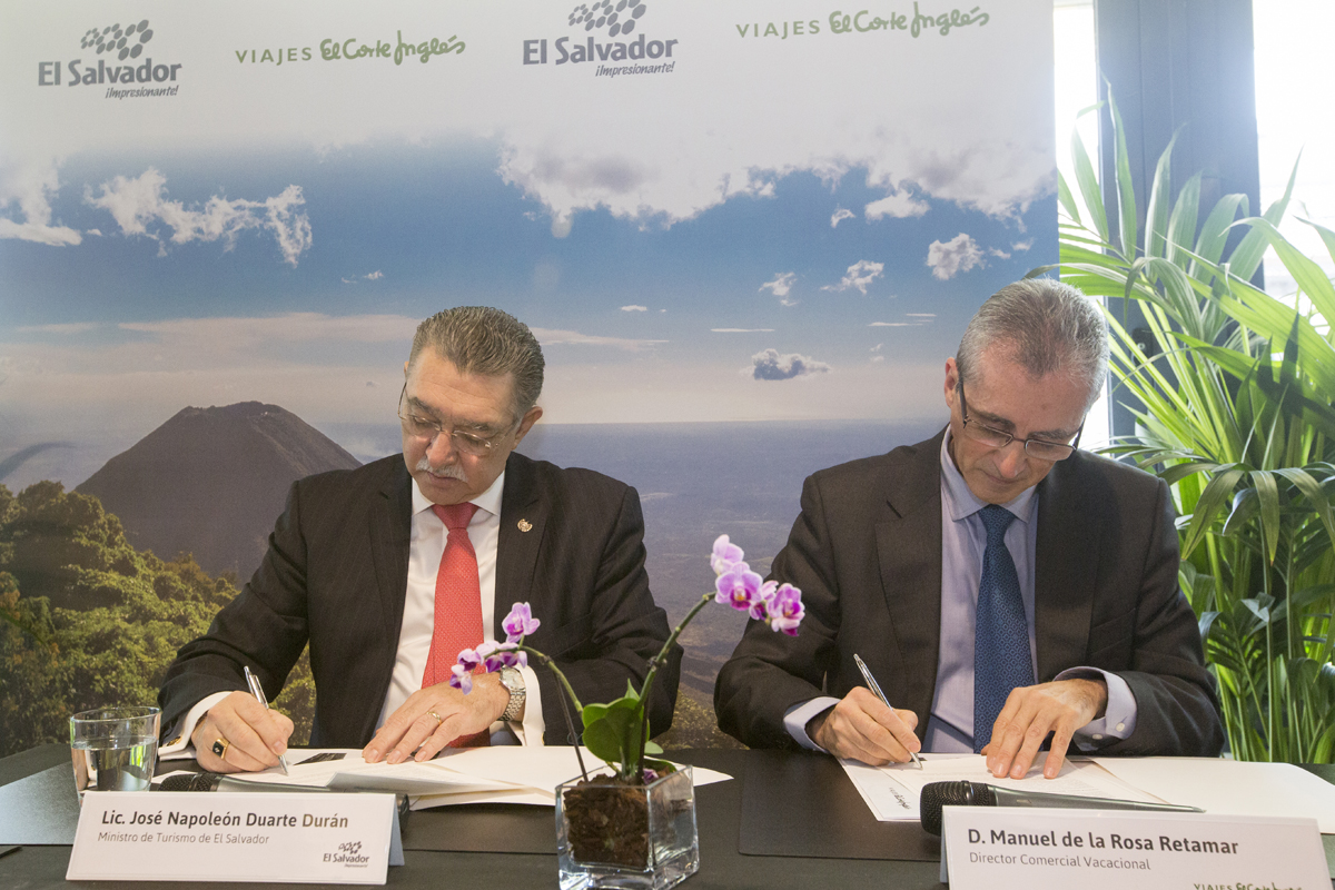 La firma del acuerdo, que ha tenido lugar este lunes en Madrid, ha sido realizada por el ministro de turismo de El Salvador, José Napoleón Duarte y el director comercial de Viajes El Corte Inglés, Manuel de la Rosa.