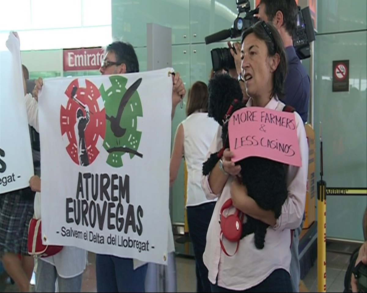 Unas cuarenta personas miembros de la Plataforma 'Aturem Eurovegas' se han concentrado a las 09.00 horas en el Aeropuerto de Barcelona, donde este lunes aterrizaba una delegación del consejo de administración de Las Vegas Sands Corporation, para mostrar el "rechazo" al proyecto Eurovegas, porque, a su juicio, se trata de un modelo económico que insiste en la crisis actual.