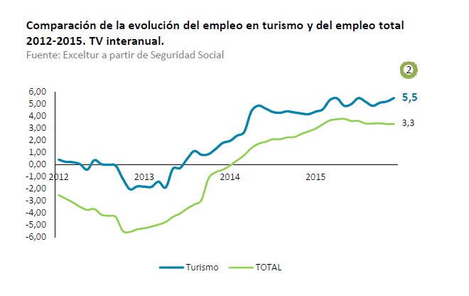 "El turismo lidera la generación de empleo neto ya que uno de cada siete nuevos puestos de trabajo en España han sido creados por el sector turístico en 2015, lo que supone 73.343 nuevos empleos, un 5,5% más que en 2014, hasta registrar una cifra total de 1,4 millones de afiliados a la Seguridad Social", destacó el vicepresidente ejecutivo de Exceltur, José Luis Zoreda, en rueda de prensa para hacer balance de 2015.