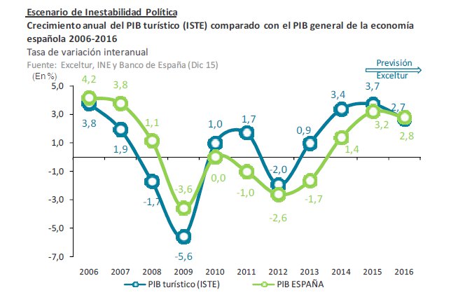 No obstante, desde Exceltur se advierte que de no conformarse un gobierno estable a corto plazo y elevarse la intensidad de las incertidumbres en el primer semestre de año, se estima que la actividad del sector turístico ralentice su subida hasta el 2,7%. Estas siete décimas supondrían unos 900 millones de euros de diferencia, según cuantificó el director de estudios e investigación de Exceltur, Oscar Perelli.