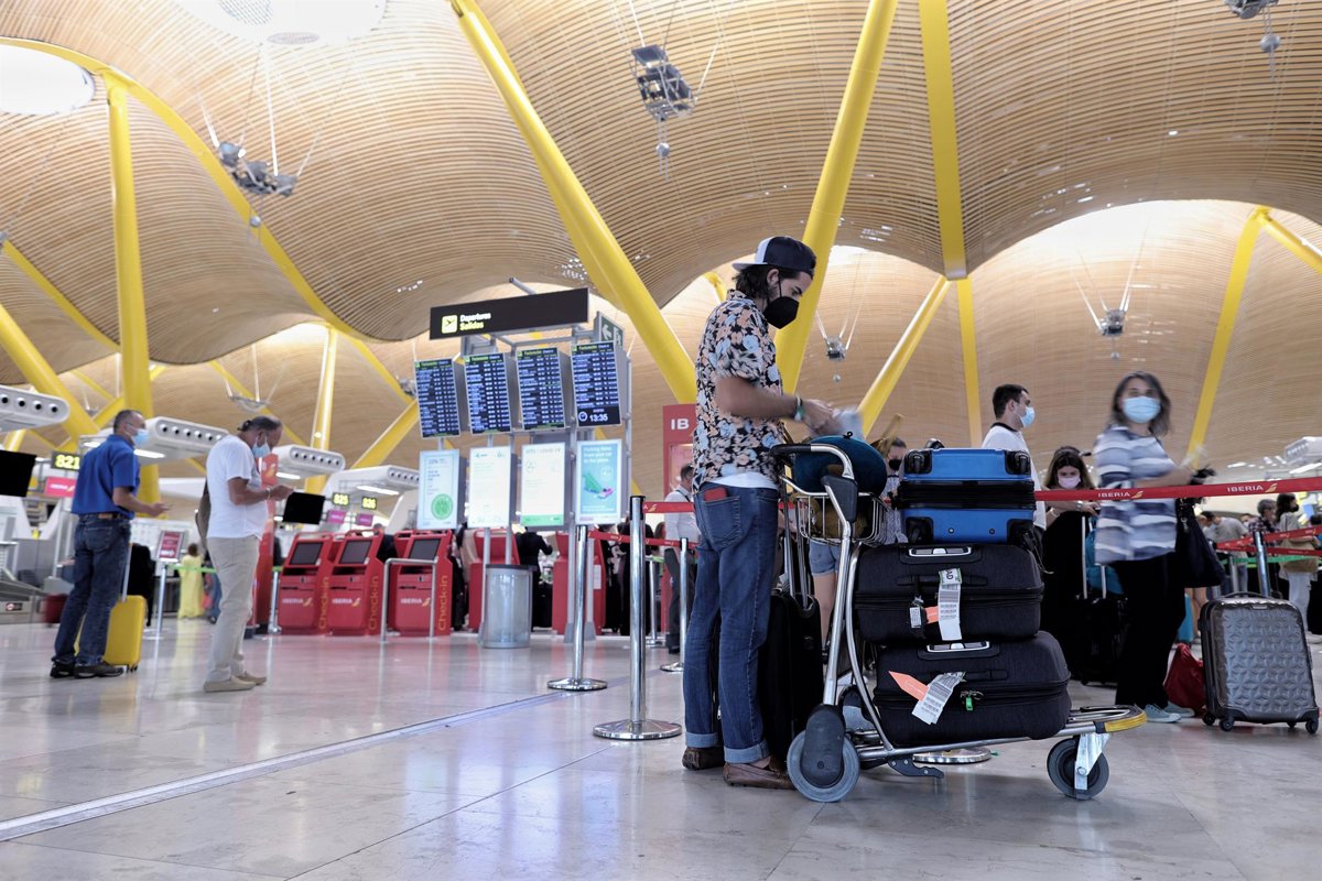 Varias personas con equipaje hacen cola en la T4 del aeropuerto Adolfo Suárez, Madrid-Barajas, en Madrid (España). - Eduardo Parra - Europa Press