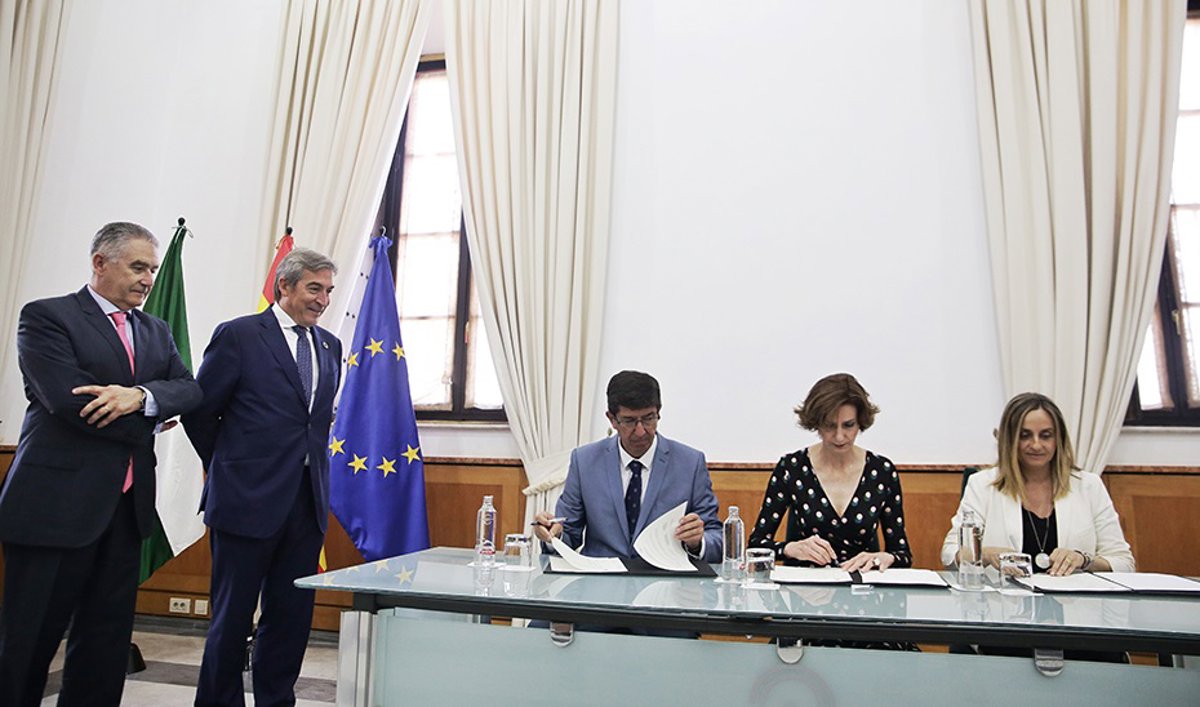 El vicepresidente de la Junta de Andalucía y consejero de Turismo, Regeneración, Justicia y Administración Local, Juan Marín; la consejera de Fomento, Infraestructuras y Ordenación del Territorio, Marifran Carazo, y la secretaria de Estado para el Turismo, Isabel Oliver Sagreras, han firmado este martes el acta de aprobación de la metodología para la implantación de nuevas señales turísticas. También ha asistido al acto el Delegado del Gobierno en Andalucía, Lucrecio Fernández.