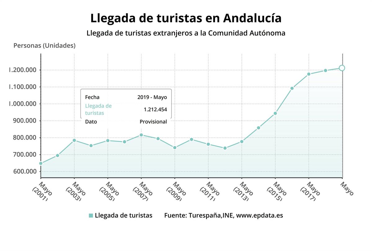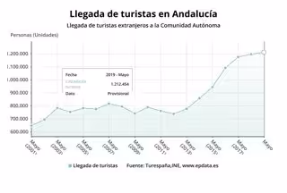 Evolución de la llegada de turistas extranjeros a Andalucía hasta mayo de 2019. - EP DATA