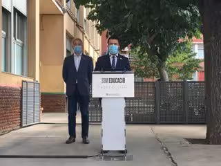 El presidente de la Generalitat, Pere Aragons, y el conseller de Educación, Josep Gonzlez-Cambray (detrás), en una rueda de prensa en la Escola Tanit de Santa Coloma de Gramenet (Barcelona) el primer día del curso 2021-2022 - EUROPA PRESS