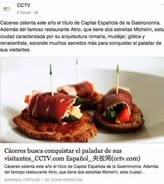 Una cadena de televisión china, a través de su portal en Internet www.cctv.com, ha dedicado en su canal español un post a los "secretos culinarios" de la gastronomía extremeña.