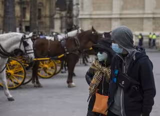 Imágenes del impacto del virus del Coronavirus en el sector turístico . Dos turistas con mascarillas pasean por el centro de Sevilla (Andalucía, España). - María José López - Europa Press