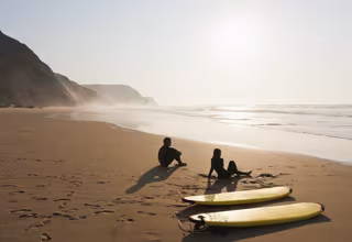 Pareja de turistas descansando en una playa junto a unas tablas de surf - MASTERCARD