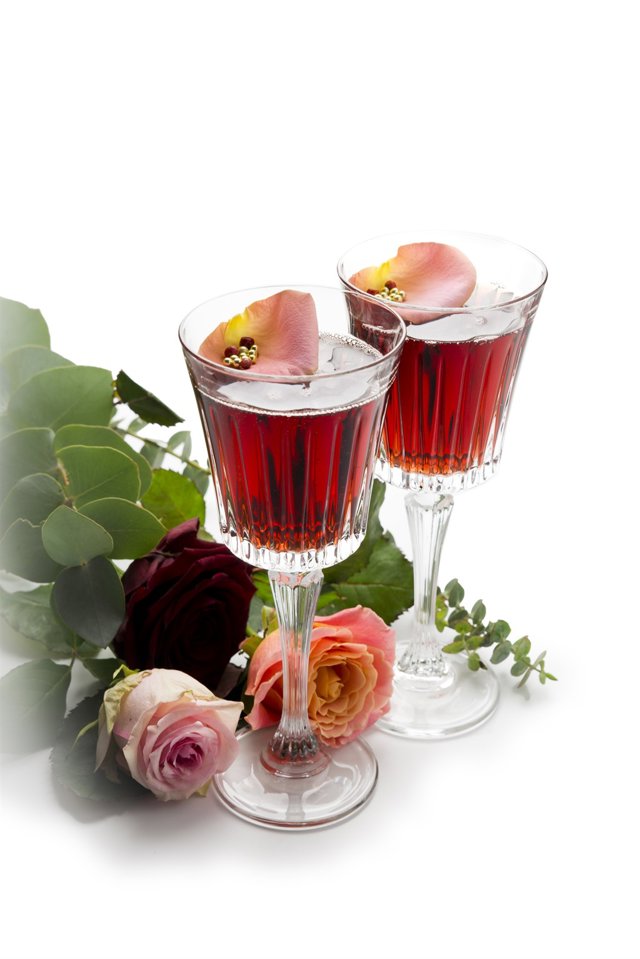 Preparación: Mezclar los ingredientes fríos en una copa de estilo romántico y decorarlo con pimienta rosa, perlas de azúcar y pétalos de rosa.