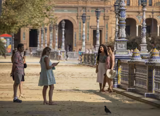 Archivo - Turistas pasean por la Plaza de España de Sevilla en una foto de archivo. A 25 de agosto de 2021. - María José López - Europa Press - Archivo