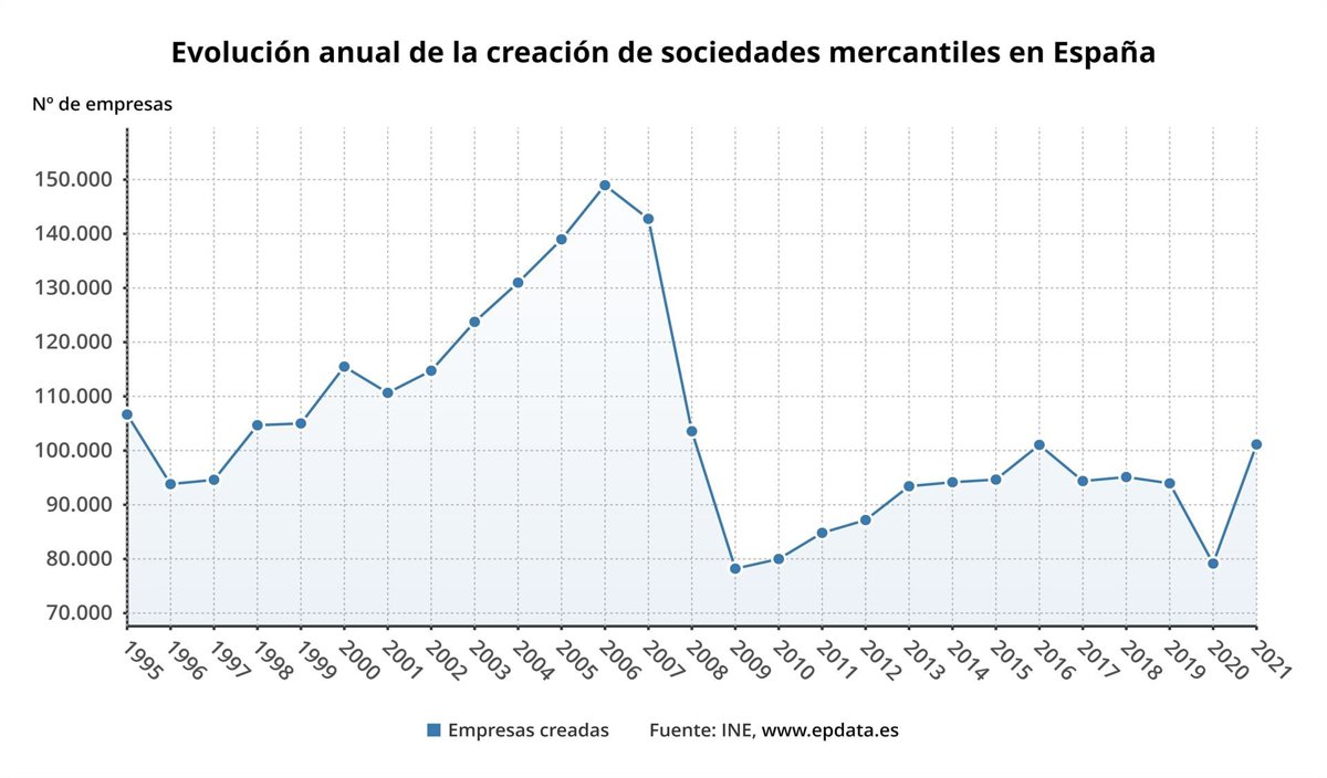 El número de nuevas sociedades mercantiles se disparó un 27,7% en 2021 respecto al año anterior, hasta sumar un total de 101.134 empresas, su mayor repunte anual desde el ejercicio 2008, según los datos difundidos este viernes por el Instituto Nacional de Estadística (INE).