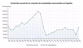 Evolución anual de la creación de empresas en España (INE) - EPDATA