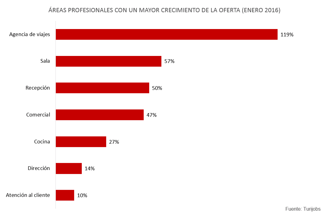 Por áreas, las que más demandan profesionales son agencias de viajes (+119% respecto a enero de 2015), Sala (+57%) y Recepción (+50%). También las áreas con mayor competitividad por vacante durante el mes de enero son recepción y reservas.