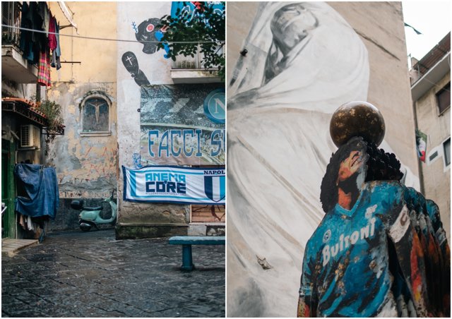 Las compras y la superstición son parte de la vida cotidiana: Via Toledo y Via dei Tribunali muestran el pulso de la ciudad, mientras que el corno napolitano, amuleto contra el mal de ojo, es un recuerdo tradicional que debe regalarse y no comprarse para uno mismo. Via San Gregorio Armeno, famosa por sus belenes, revela cómo lo sagrado y lo popular se entrelazan en la ciudad.