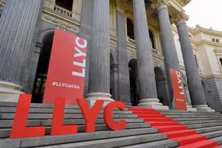 Archivo - El palacio de la Bolsa decorado con el logo de LLYC este jueves. - RAFA MARTIN/LLYC - Archivo