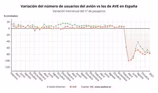 Variación anual del número de usuarios de avión y de AVE en España hasta enero de 2021 (INE) - EPDATA