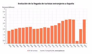 España regresa a cifras prepandemia turísticas recibiendo el pasado mes de enero la visita de un total de 4,1 millones de turistas internacionales, un 65,8% más que el mismo mes del año pasado, que gastaron en nuestro país entorno a 5.218 millones de euros, un 71,1% más, según datos hechos públicos este viernes por el Instituto Nacional de Estadística (INE).