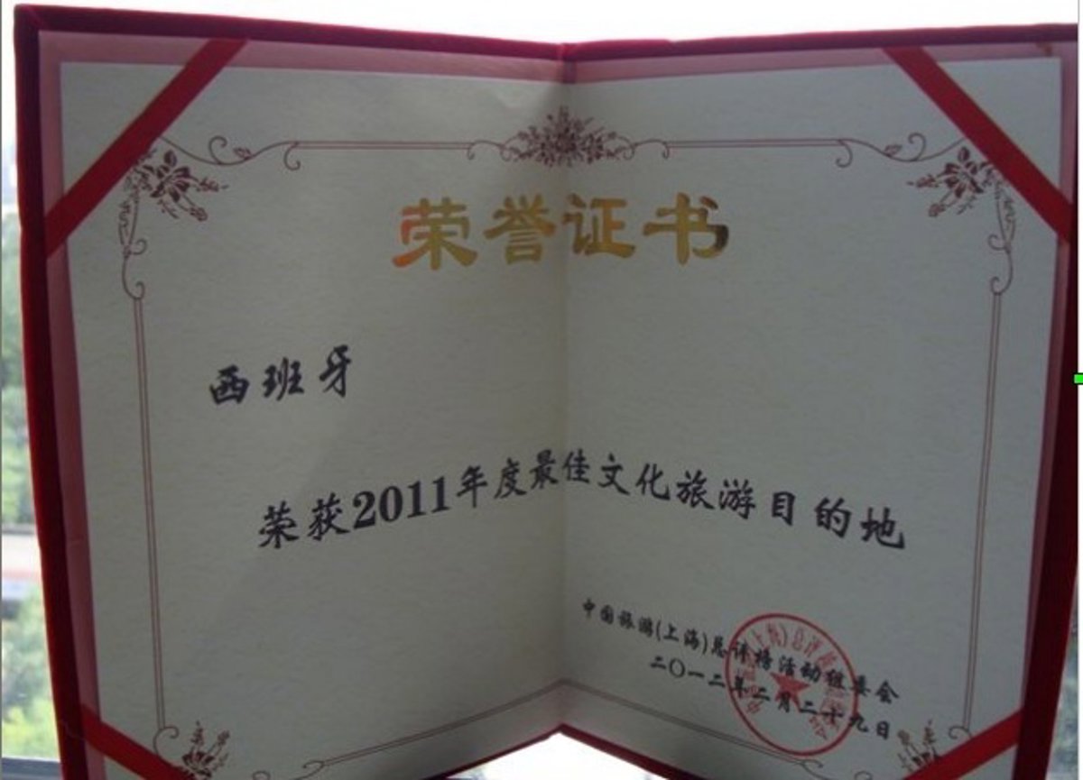 La Travel Weekly China, revista profesional, ortorgó el trofeo a España como 'Mejor destino cultural del año en China", dentro del Travel and Meetings Industry Awards China 2012, el pasado 9 de mayo.
