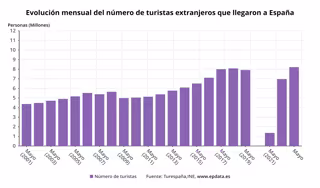 España recibió en mayo la visita récord de 8,2 millones de turistas internacionales, un 17,6% más que en el mismo mes de 2022 y un 3,8% más que en mayo de 2019, antes de la pandemia.